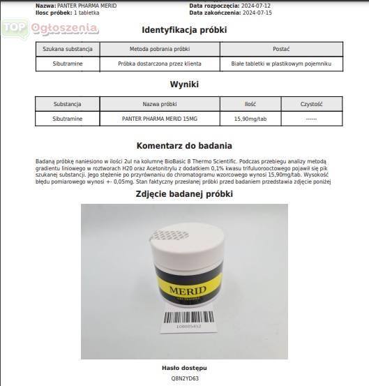 Sprzedam sibutramine merid panther pharma 30tab 15mg. Przebadana w laboratorium. Badania do wglądu na zdjęciu, mogę przesłać pełne na życzenie. Wysyłka 24h!